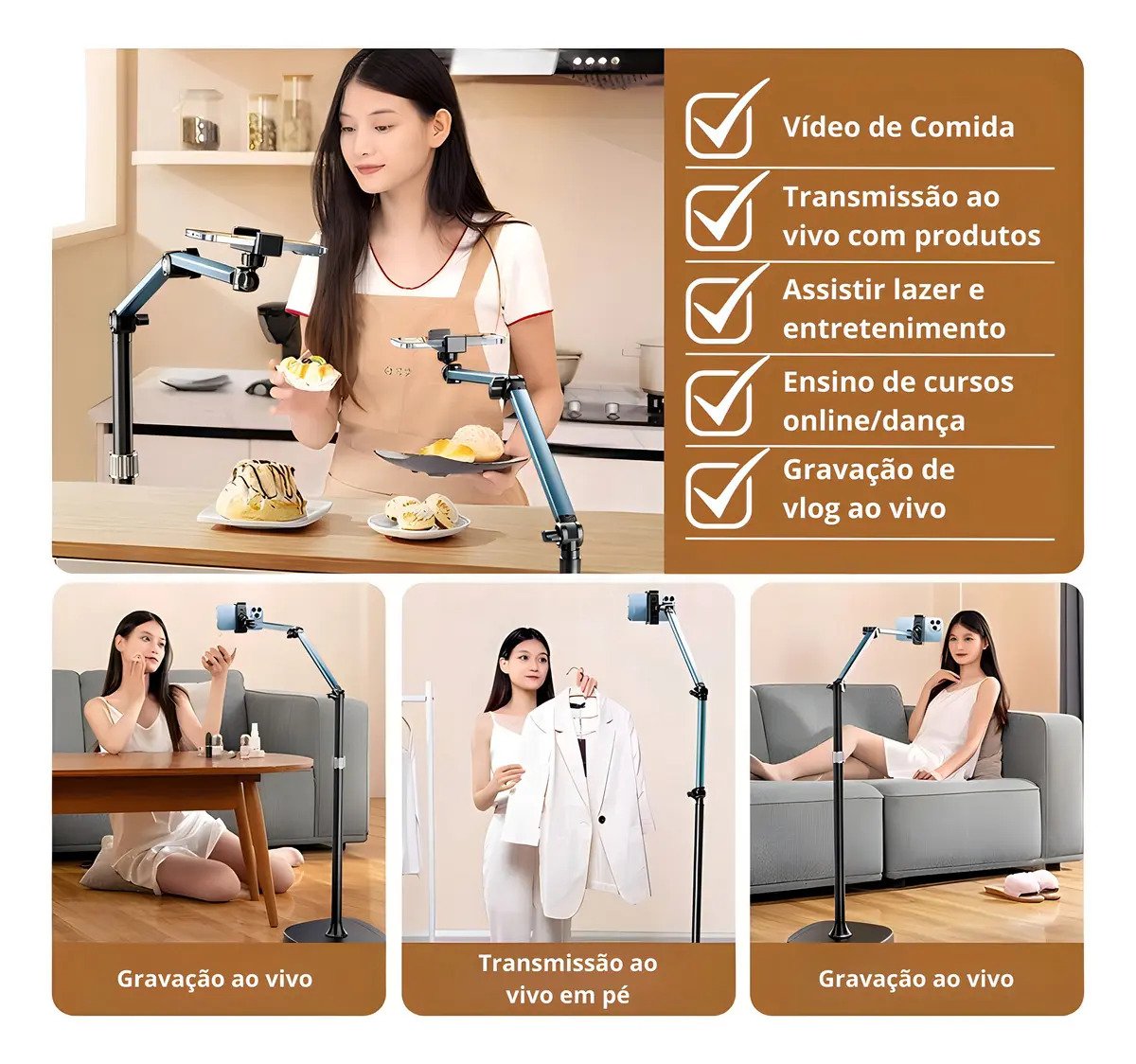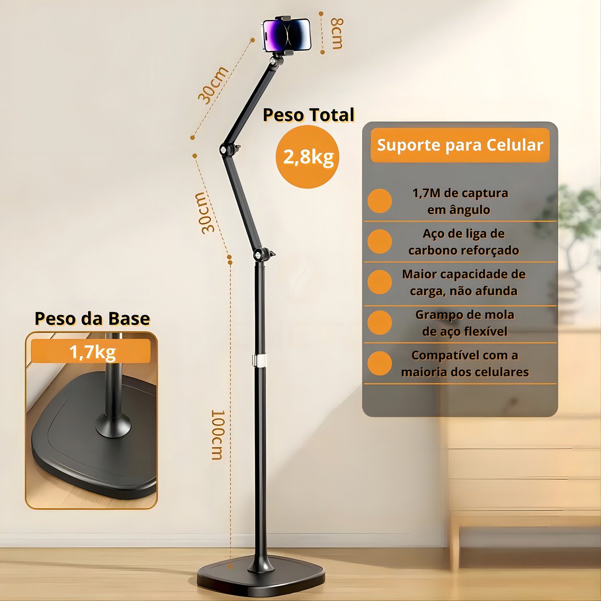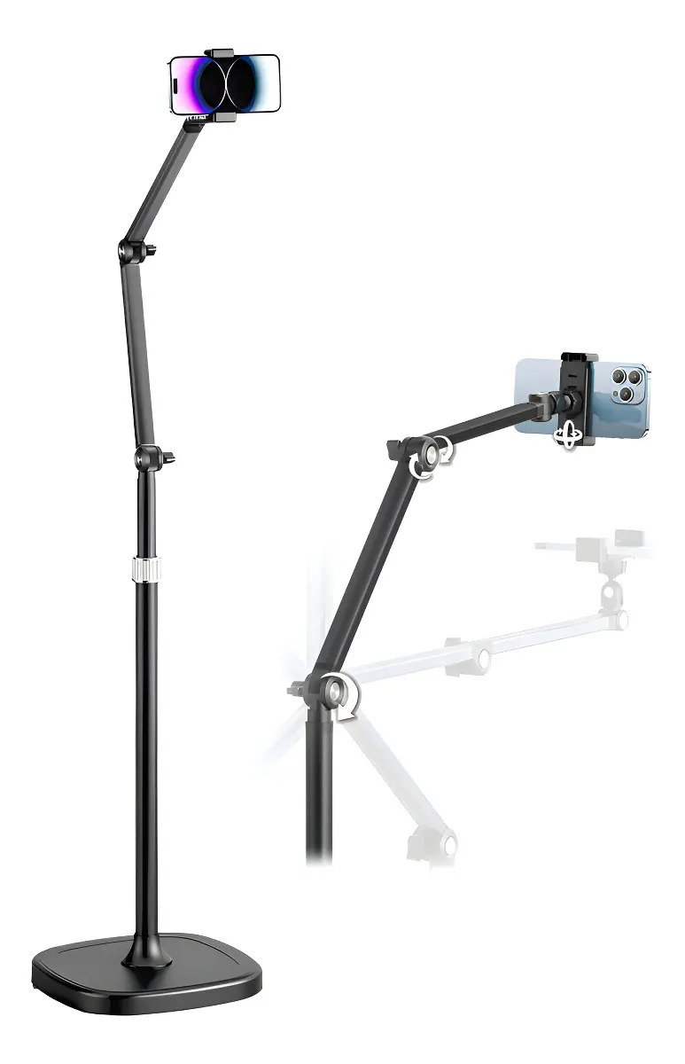 Este suporte de chão articulado é ideal para gravação de vídeos, lives e fotos, proporcionando estabilidade e praticidade.