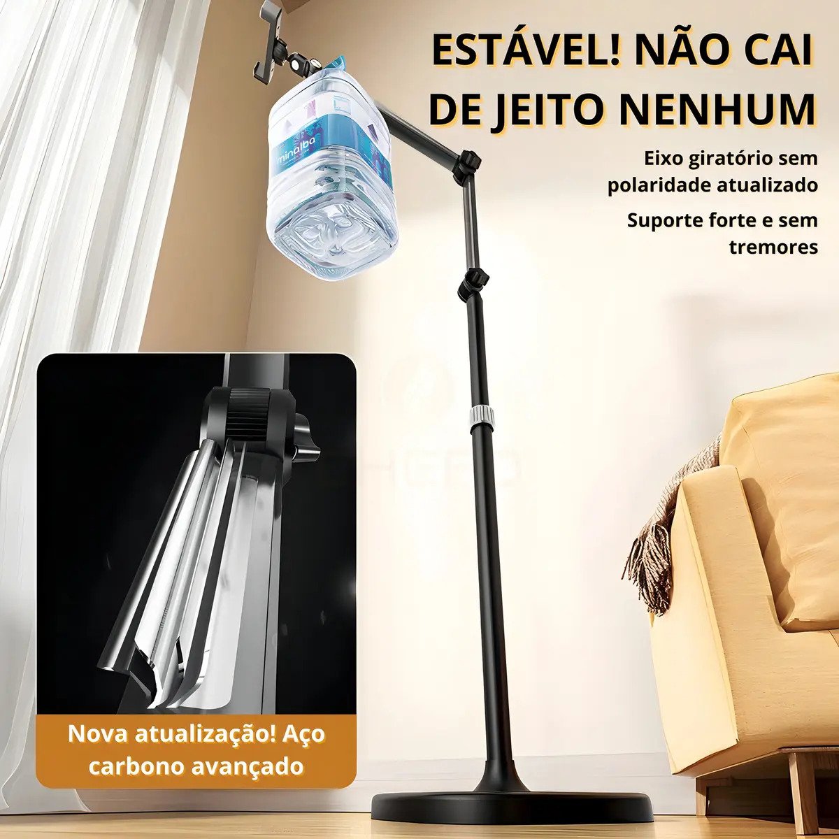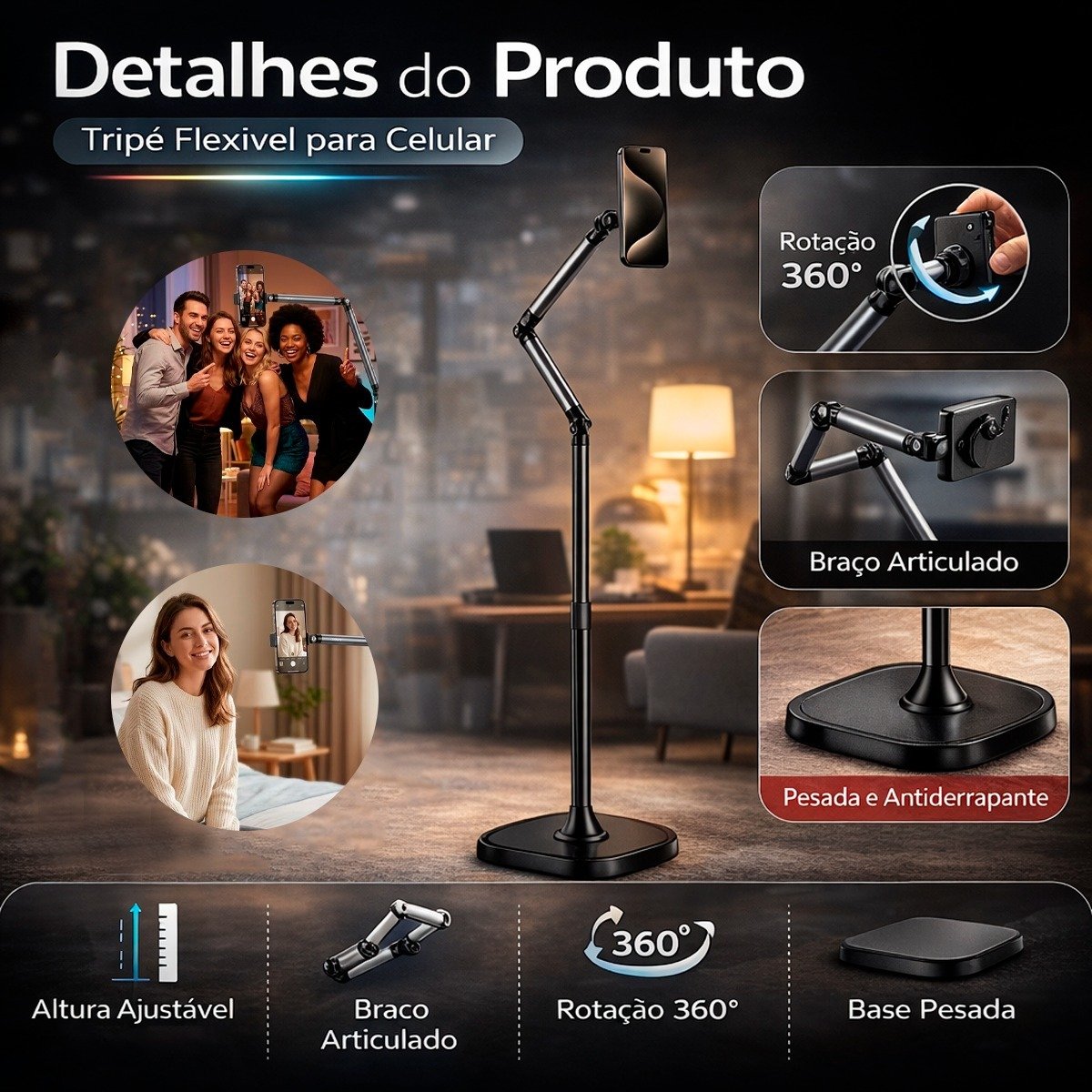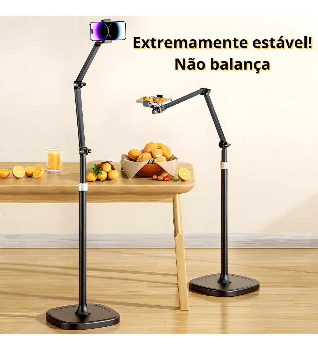 Este suporte de chão articulado é ideal para gravação de vídeos, lives e fotos, proporcionando estabilidade e praticidade.