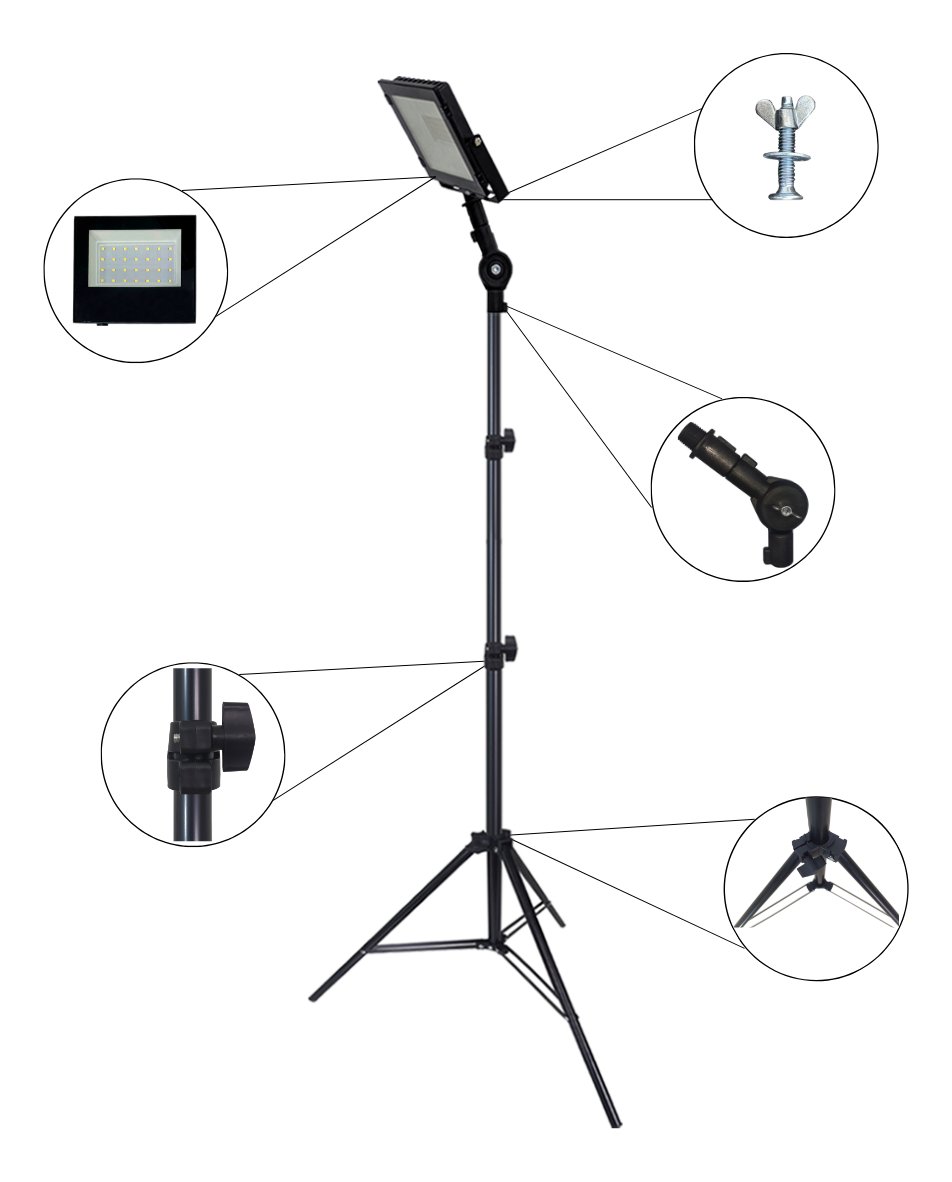 pedestal para holofote; tripé reclinável; refletor/holofote LED 50W; iluminação de obra; luz de trabalho; bivolt; branco frio; iluminação profissional; estúdio, foto, vídeo; eventos; oficina; vitrine.